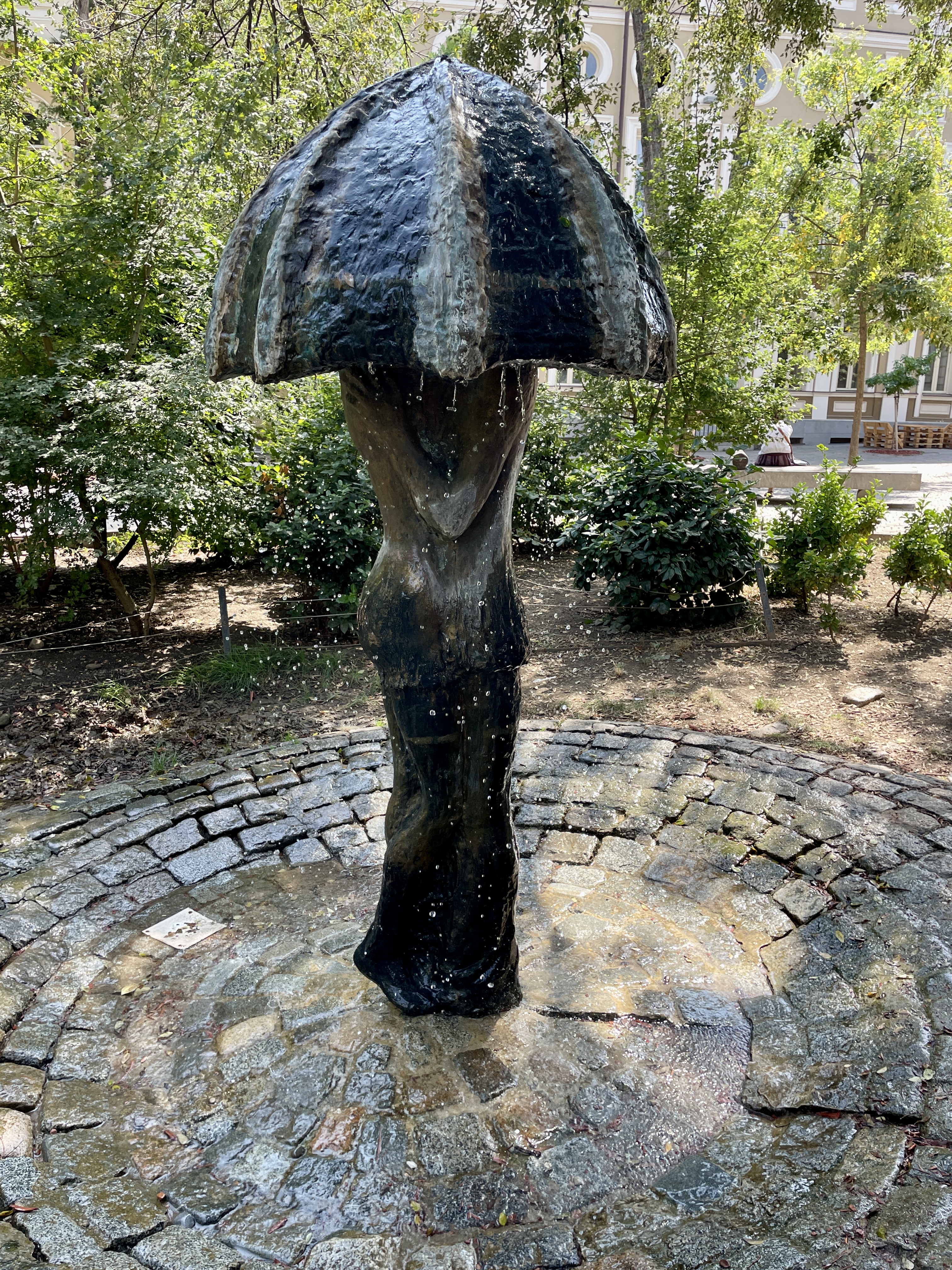 We found a quiet place, Gudiashvili Square, with just a few locals walking their dogs or sitting chatting. In the centre is a fountain made from a charming statue of two lovers under an umbrella.